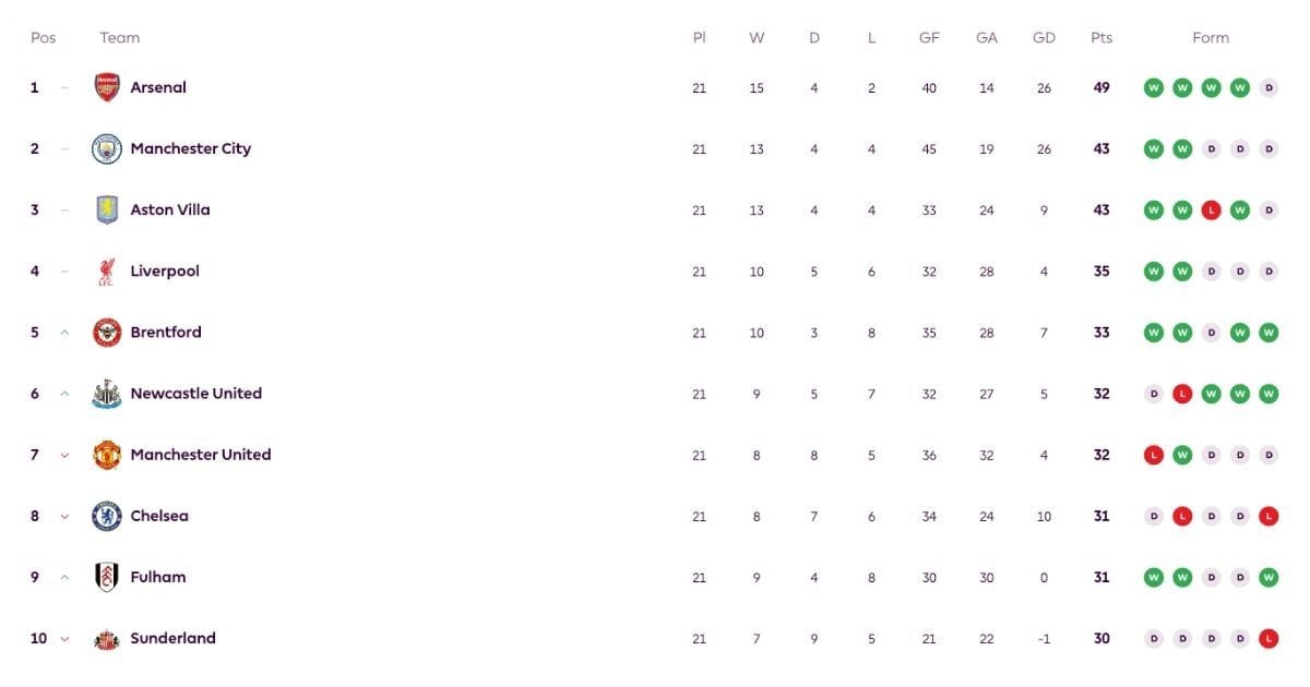 The current Top 10 of the 20-team premier league table